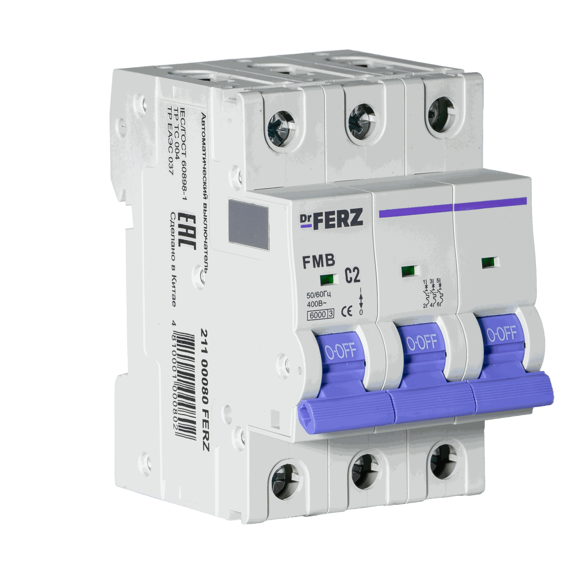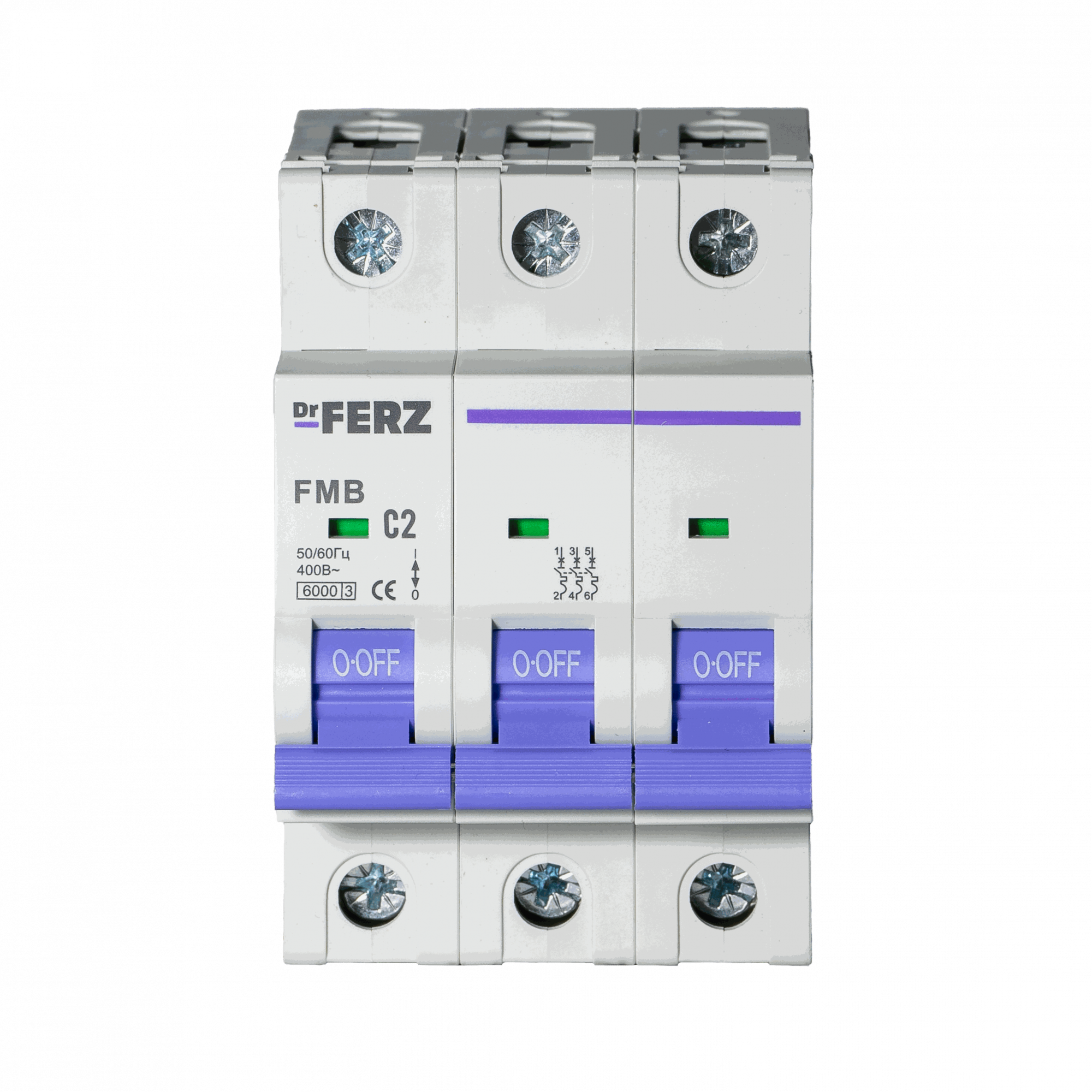 Модульный автоматический выключатель Dr.FERZ серии FMB-C предназначен для защиты цепей переменного тока AC от перегрузок и короткого замыкания. Данная модификация имеет исполнение 3P, номинальный ток 2 А, характеристику срабатывания C и предельную отключающую способность 6 кА.