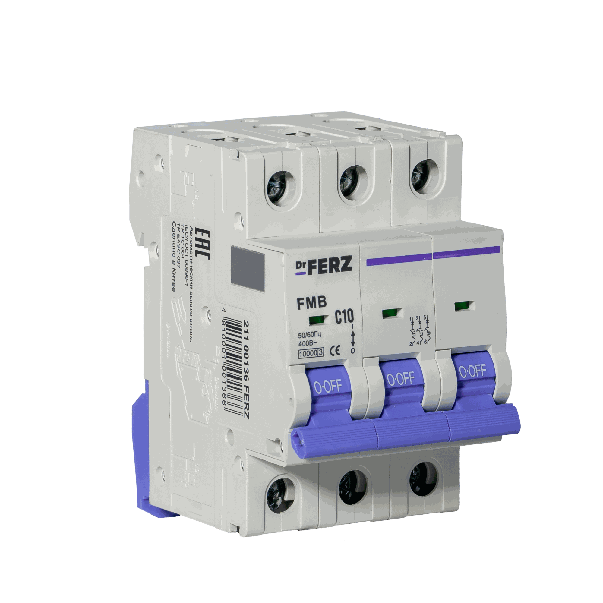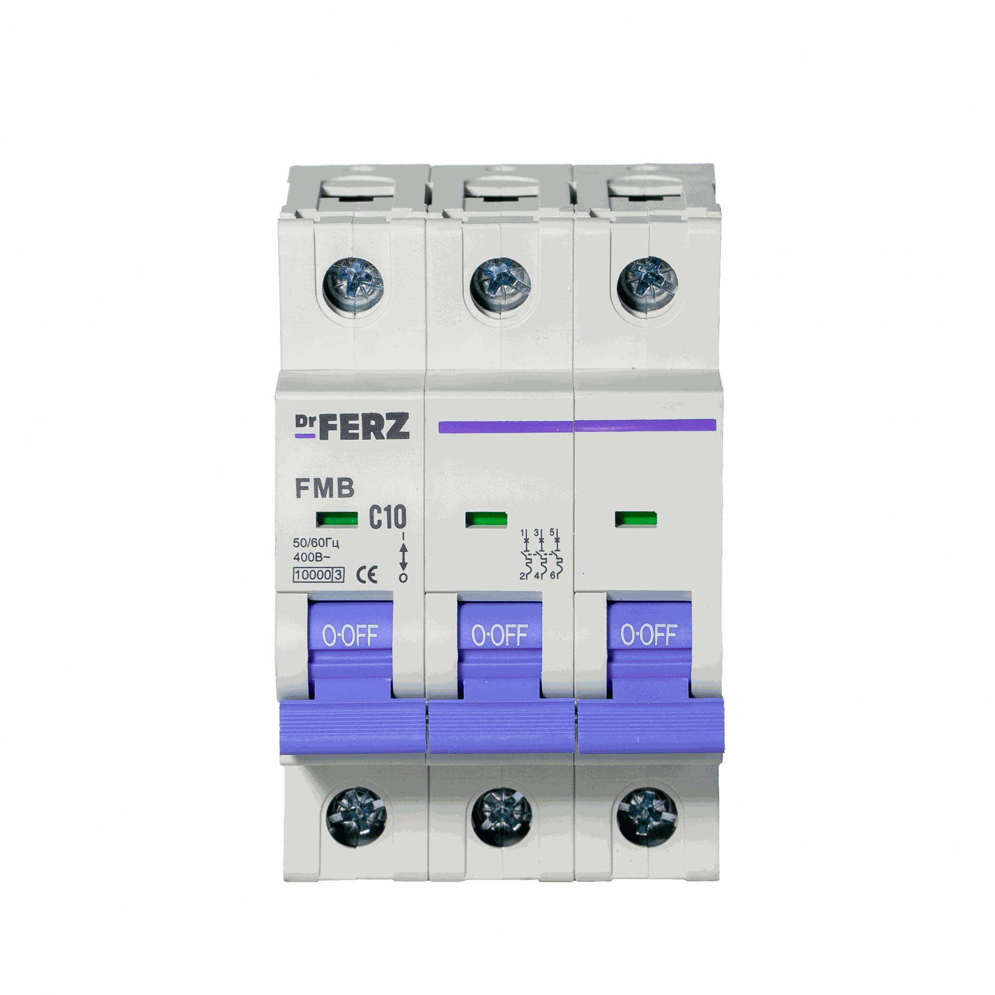 Модульный автоматический выключатель Dr.FERZ серии FMB-C предназначен для защиты цепей переменного тока AC от перегрузок и короткого замыкания. Данная модификация имеет исполнение 3P, номинальный ток 10 А, характеристику срабатывания C и предельную отключающую способность 10 кА.