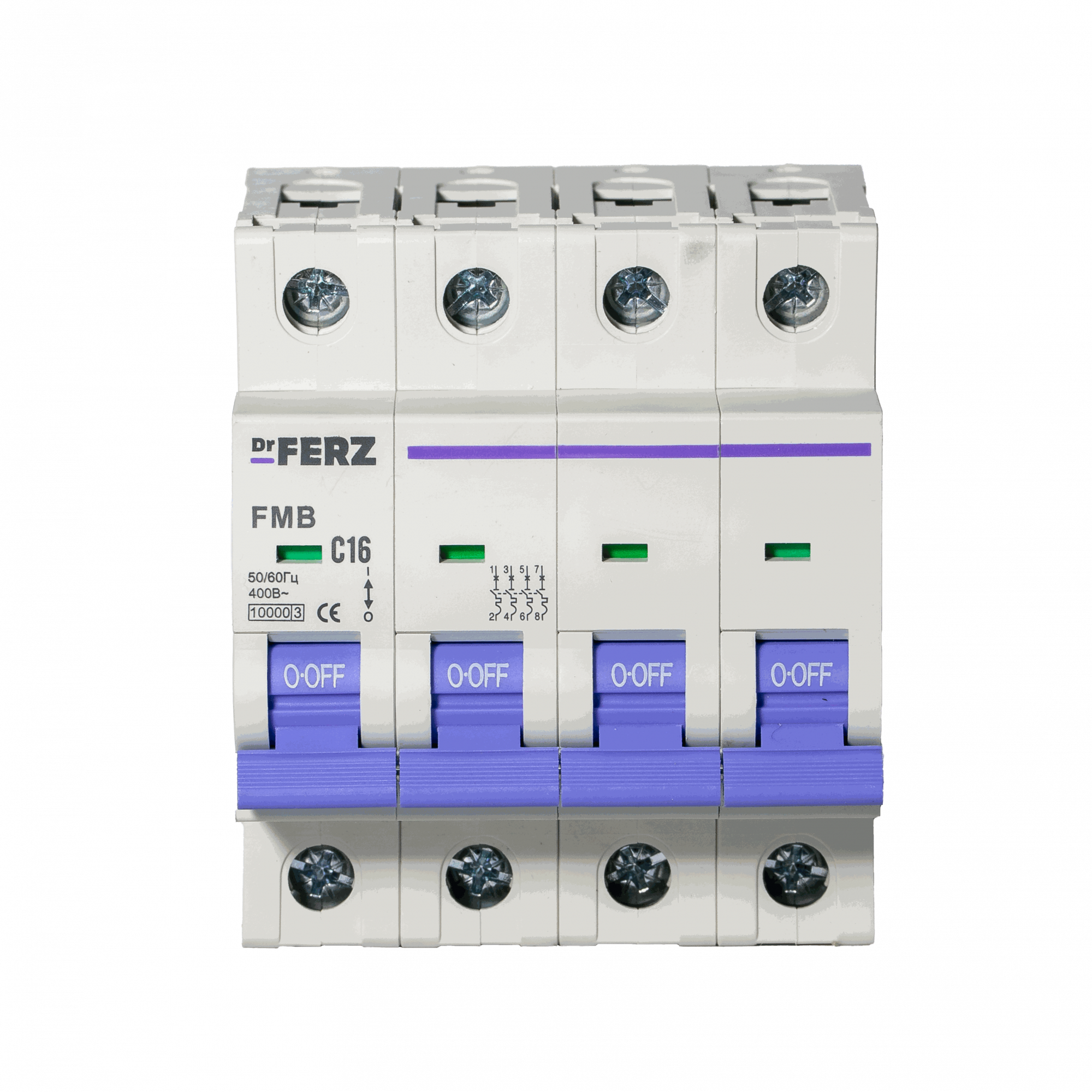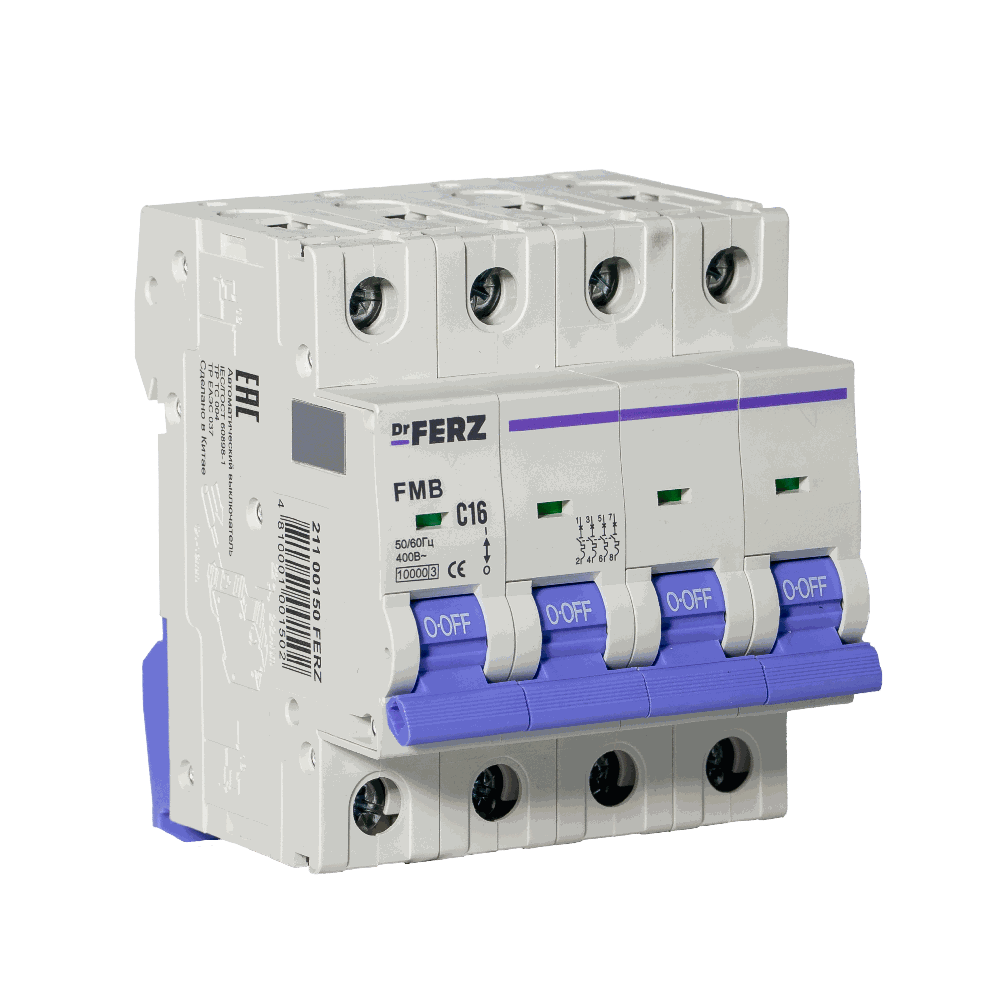 Модульный автоматический выключатель Dr.FERZ серии FMB-C предназначен для защиты цепей переменного тока AC от перегрузок и короткого замыкания. Данная модификация имеет исполнение 4P, номинальный ток 16 А, характеристику срабатывания C и предельную отключающую способность 10 кА.