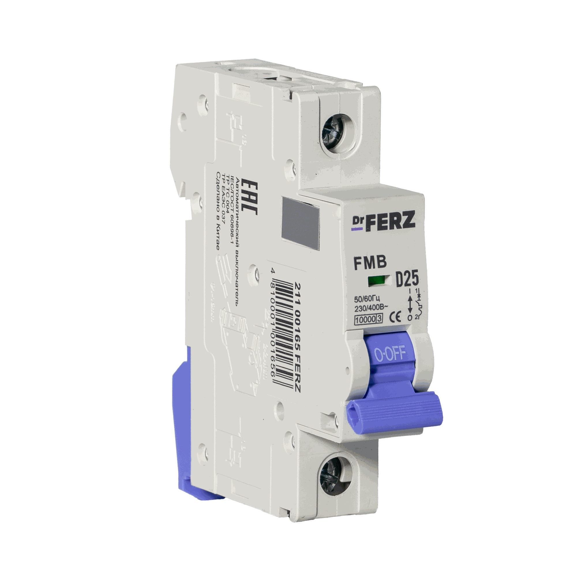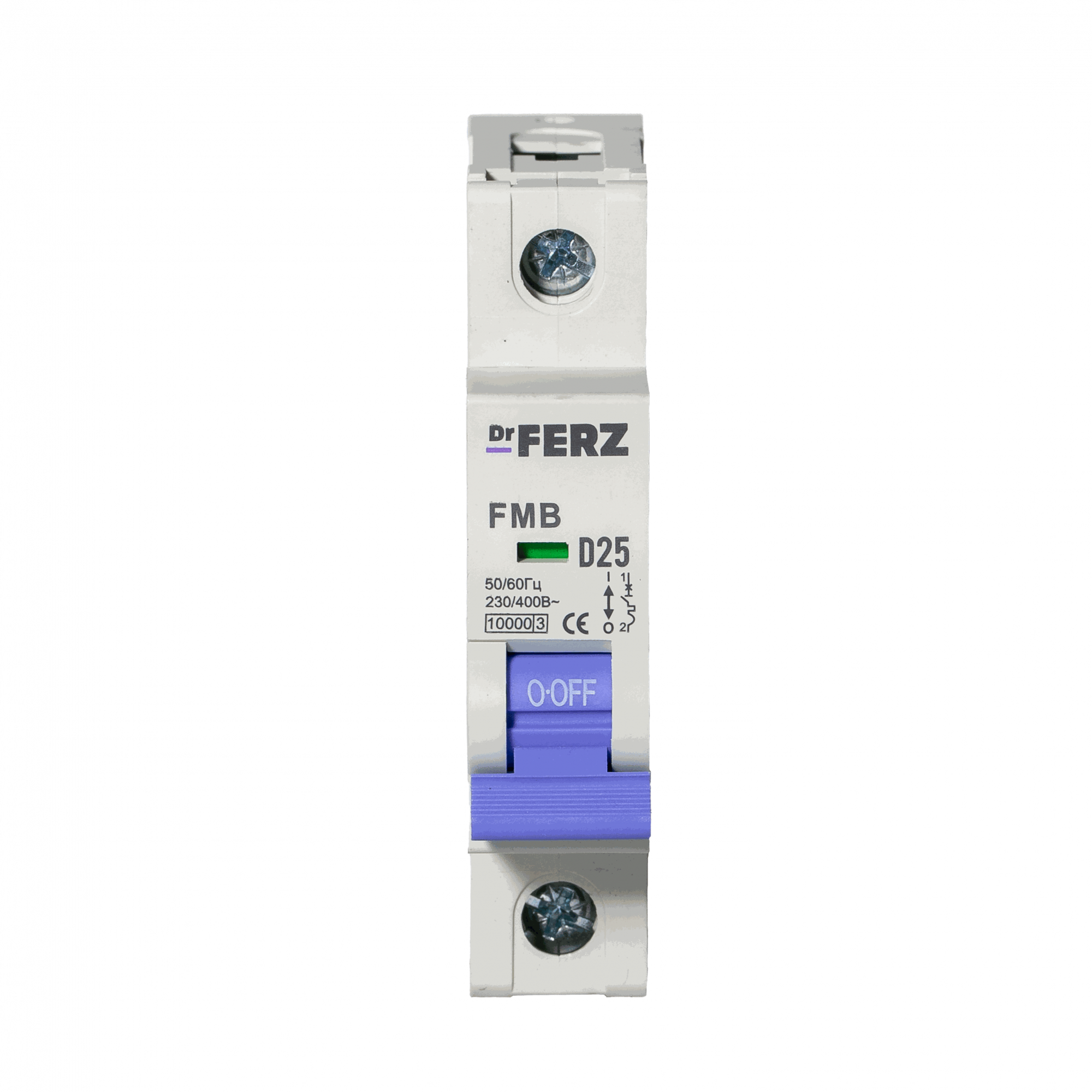 Модульный автоматический выключатель Dr.FERZ серии FMB-D предназначен для защиты цепей переменного тока AC от перегрузок и короткого замыкания. Данная модификация имеет исполнение 1P, номинальный ток 25 А, характеристику срабатывания D и предельную отключающую способность 10 кА.