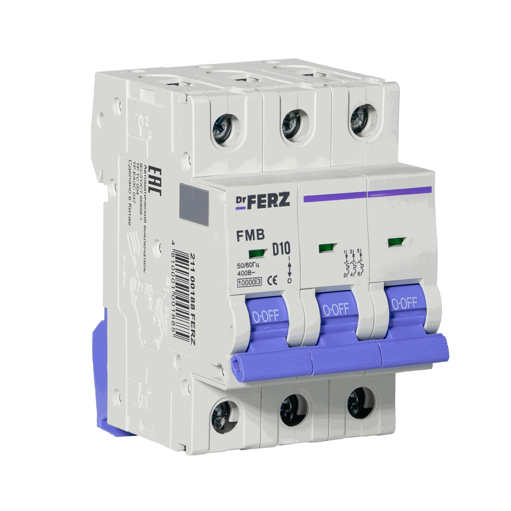 Модульный автоматический выключатель Dr.FERZ серии FMB-D предназначен для защиты цепей переменного тока AC от перегрузок и короткого замыкания. Данная модификация имеет исполнение 3P, номинальный ток 10 А, характеристику срабатывания D и предельную отключающую способность 10 кА.