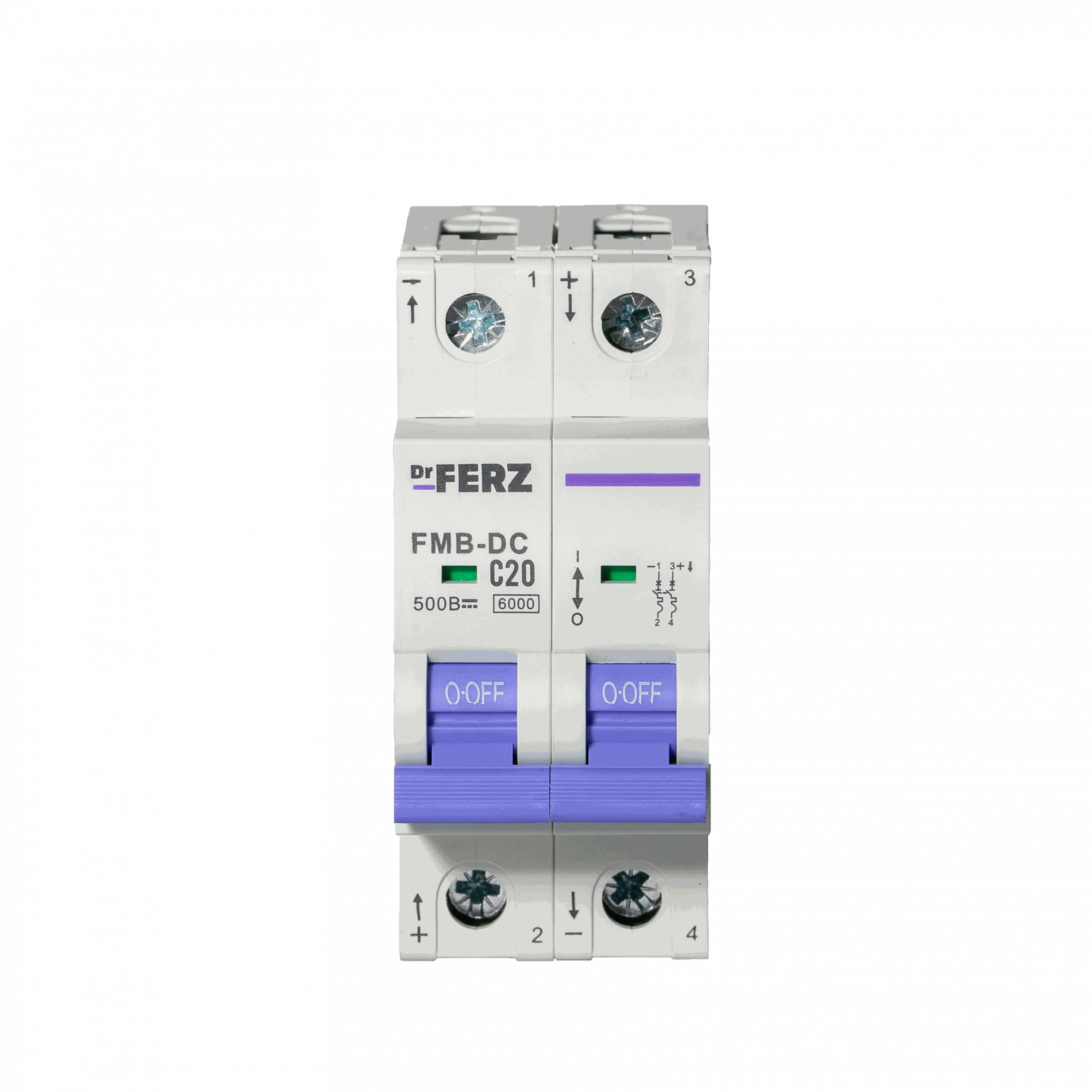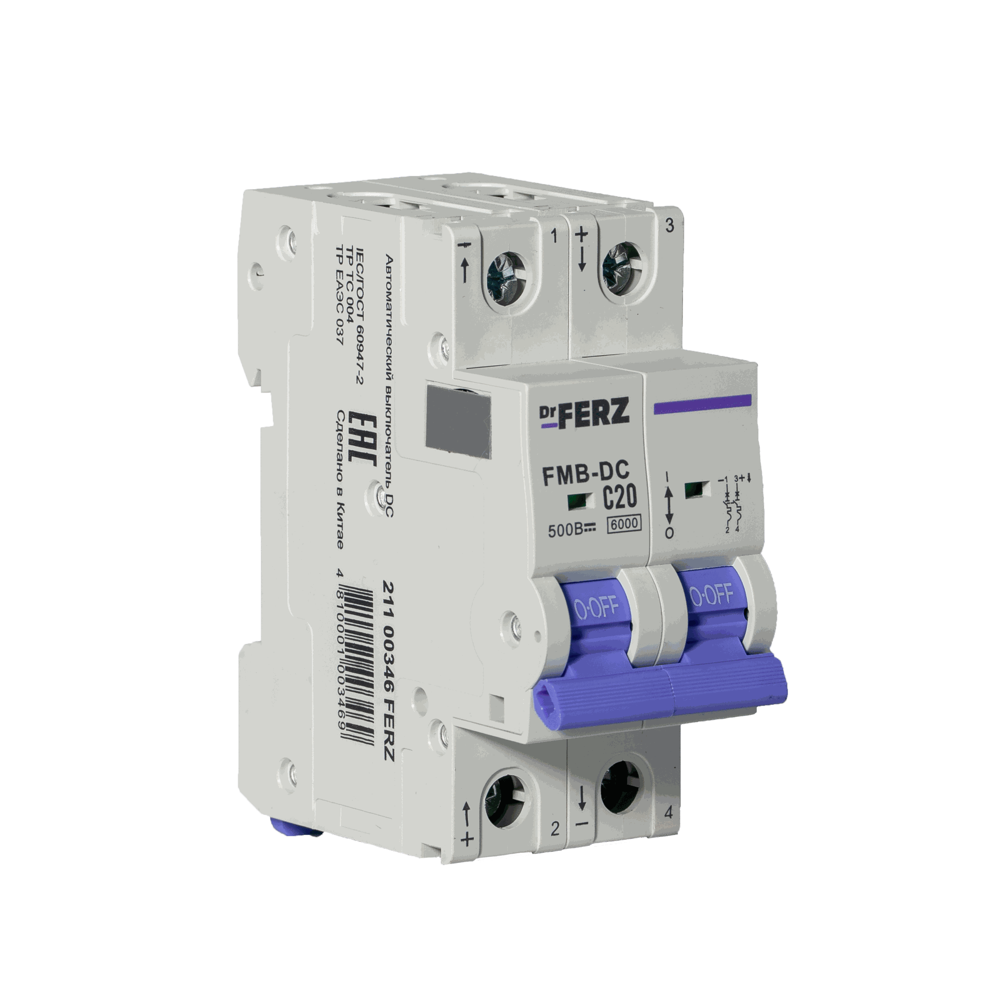 Модульный автоматический выключатель Dr.FERZ серии FMB-DC предназначен для защиты цепей постоянного тока DC от перегрузок и короткого замыкания. Данная модификация имеет исполнение 2P, номинальный ток 20 А, характеристику срабатывания C, предельную отключающую способность 6 кА и рассчитана на применение в цепях до DC 500 В.
