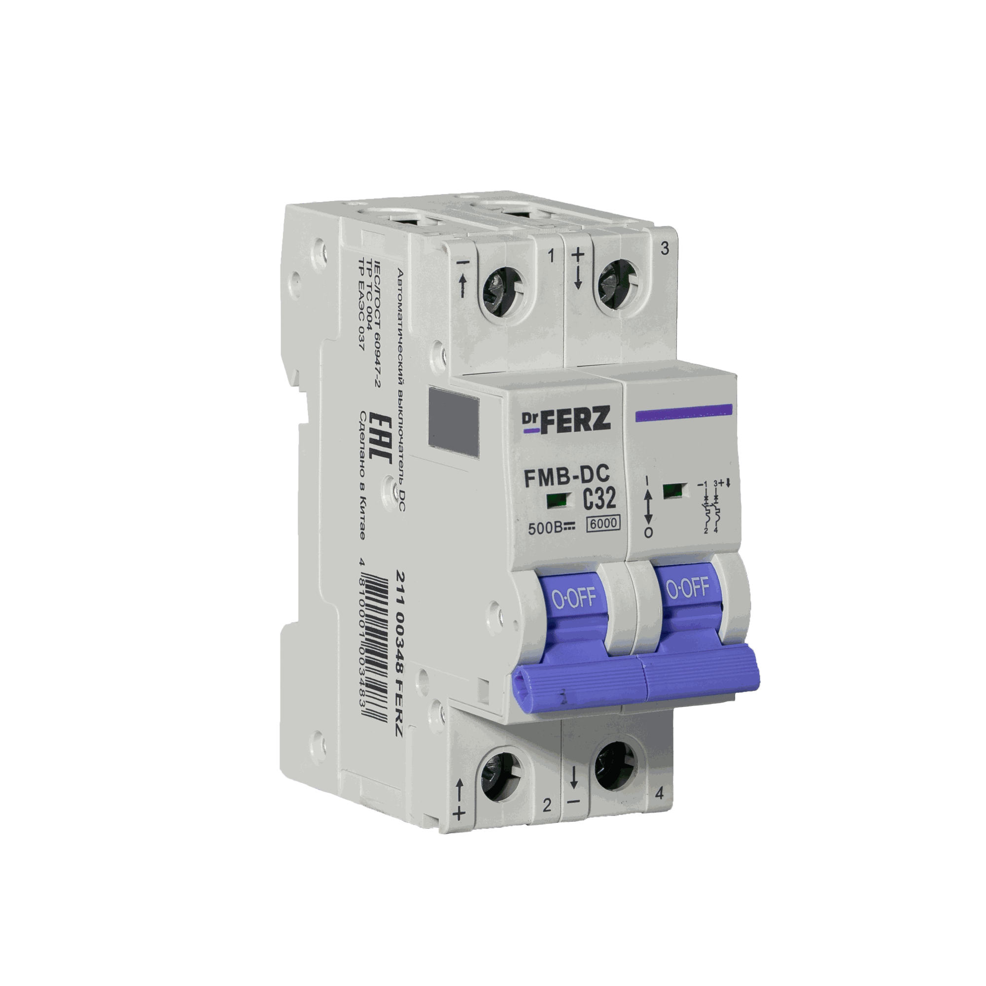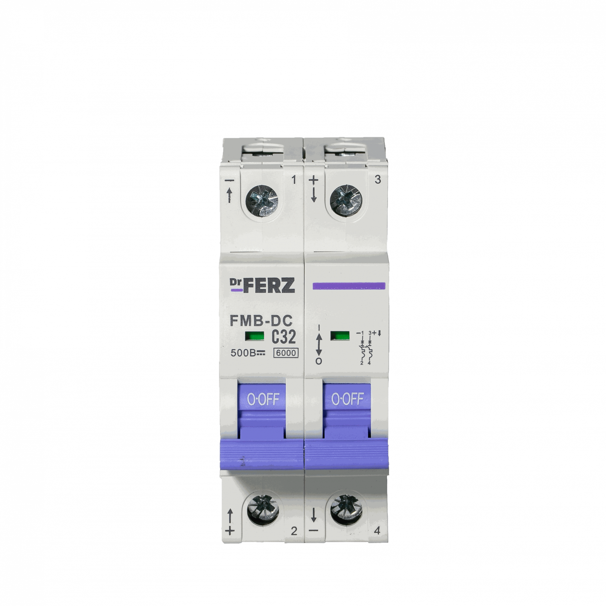 Модульный автоматический выключатель Dr.FERZ серии FMB-DC предназначен для защиты цепей постоянного тока DC от перегрузок и короткого замыкания. Данная модификация имеет исполнение 2P, номинальный ток 32 А, характеристику срабатывания C, предельную отключающую способность 6 кА и рассчитана на применение в цепях до DC 500 В.