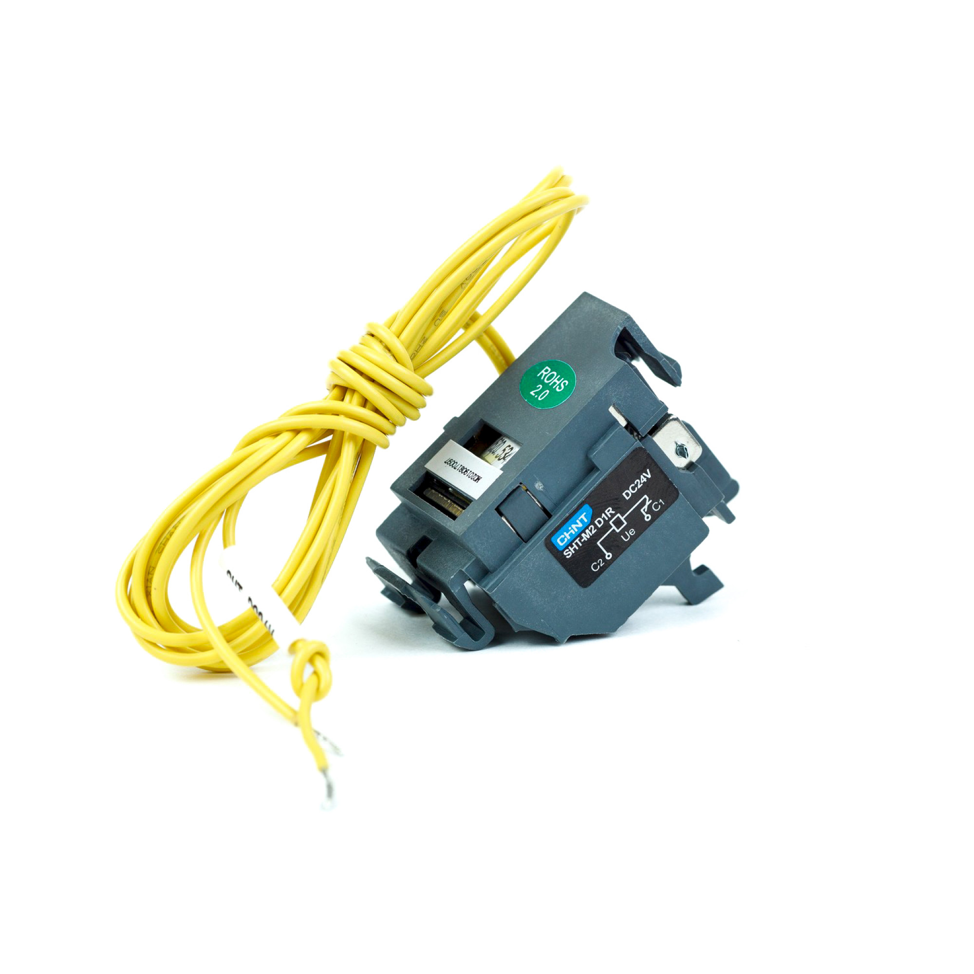 Независимый расцепитель Chint SHT-M2 отключает автоматический выключатель при подаче на него напряжения 24 вольта постоянного тока. Применяется для реализации электрических взаимных блокировок, удалённого управления и подключения внешних защитных устройств: реле напряжения, дифференциального реле, реле контроля изоляции и других. Представляет собой электромагнитную катушку якорь которой воздействует на механизм отключения автоматического выключателя. Выключатель невозможно включить, пока на расцепитель подаётся напряжение.