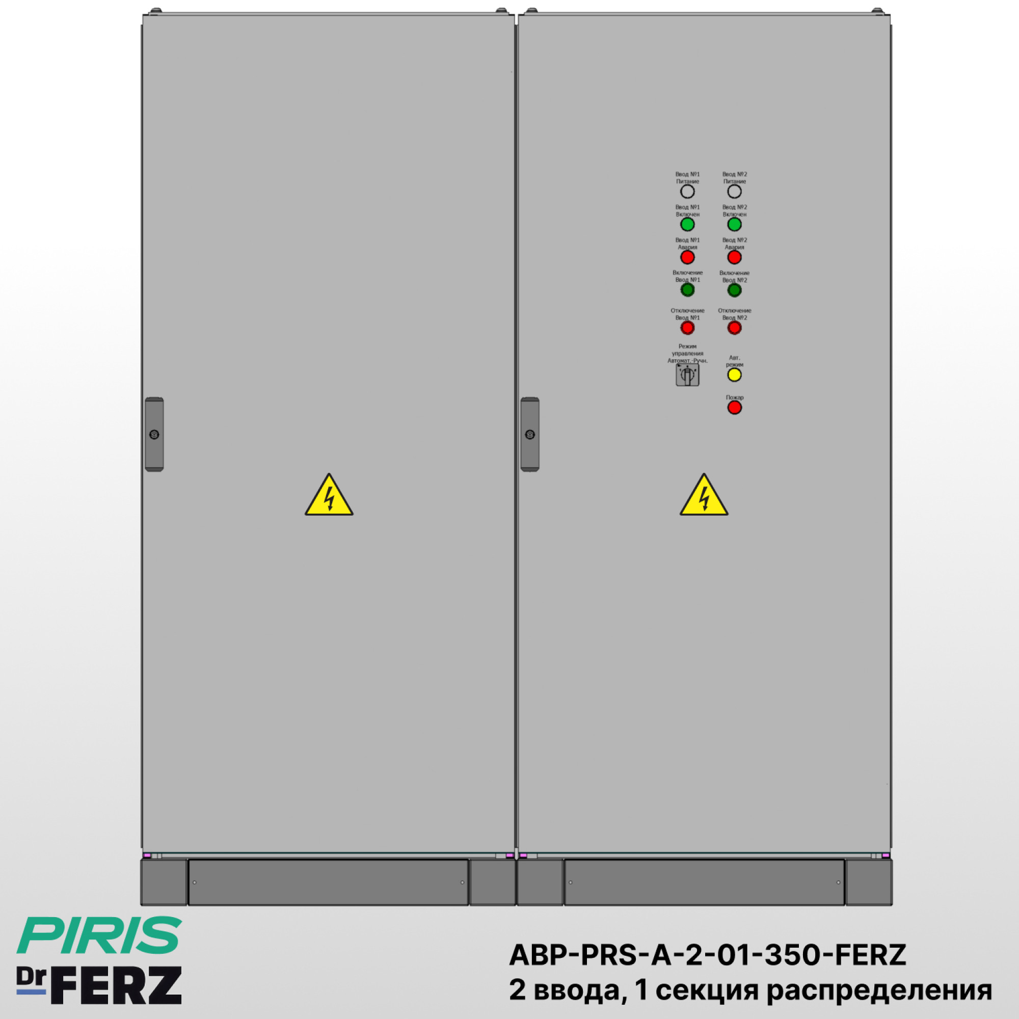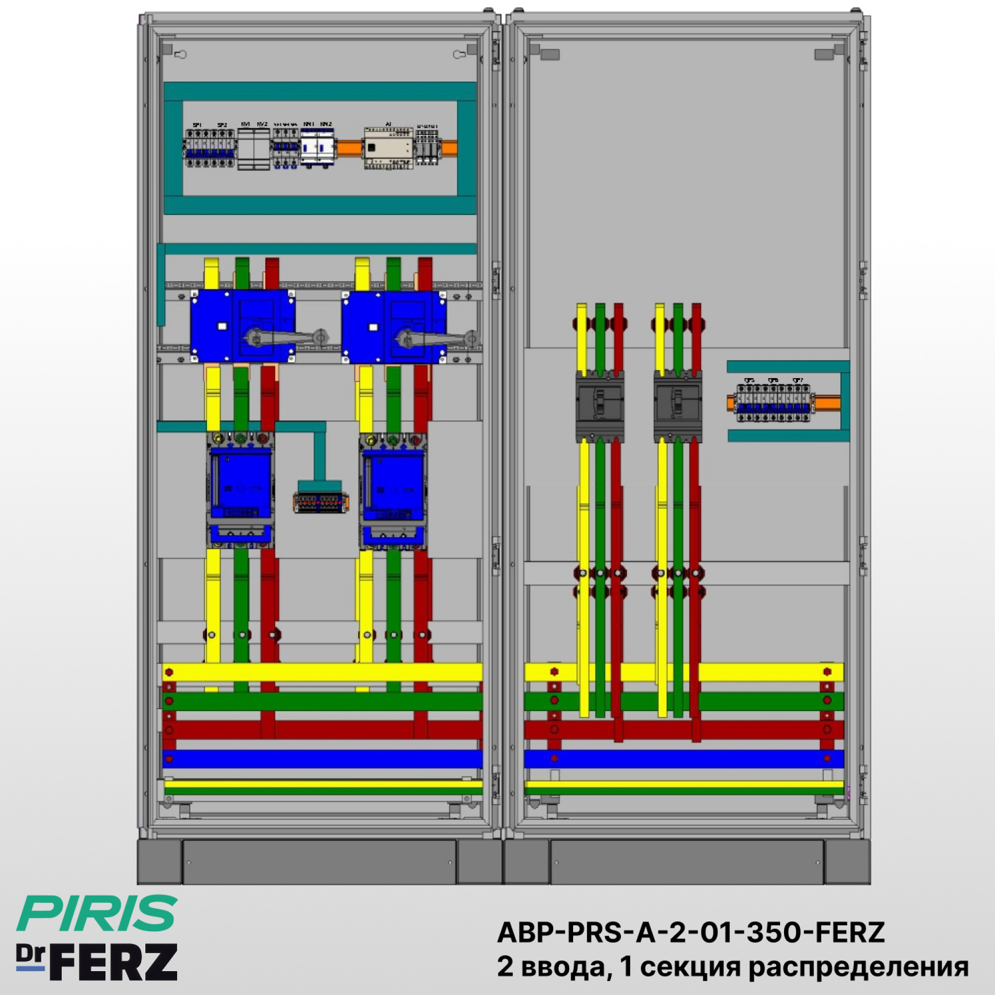 Вводы выполнены на автоматических выключателях в литом корпусе FERZ с моторными приводами. Коммутацию и алгоритм работы АВР обеспечивает контроллер управления, который контролирует наличие и качество напряжения на вводах, формирует задержки переключения, исключает одновременное включение обоих вводов и управляет исполнительными аппаратами.