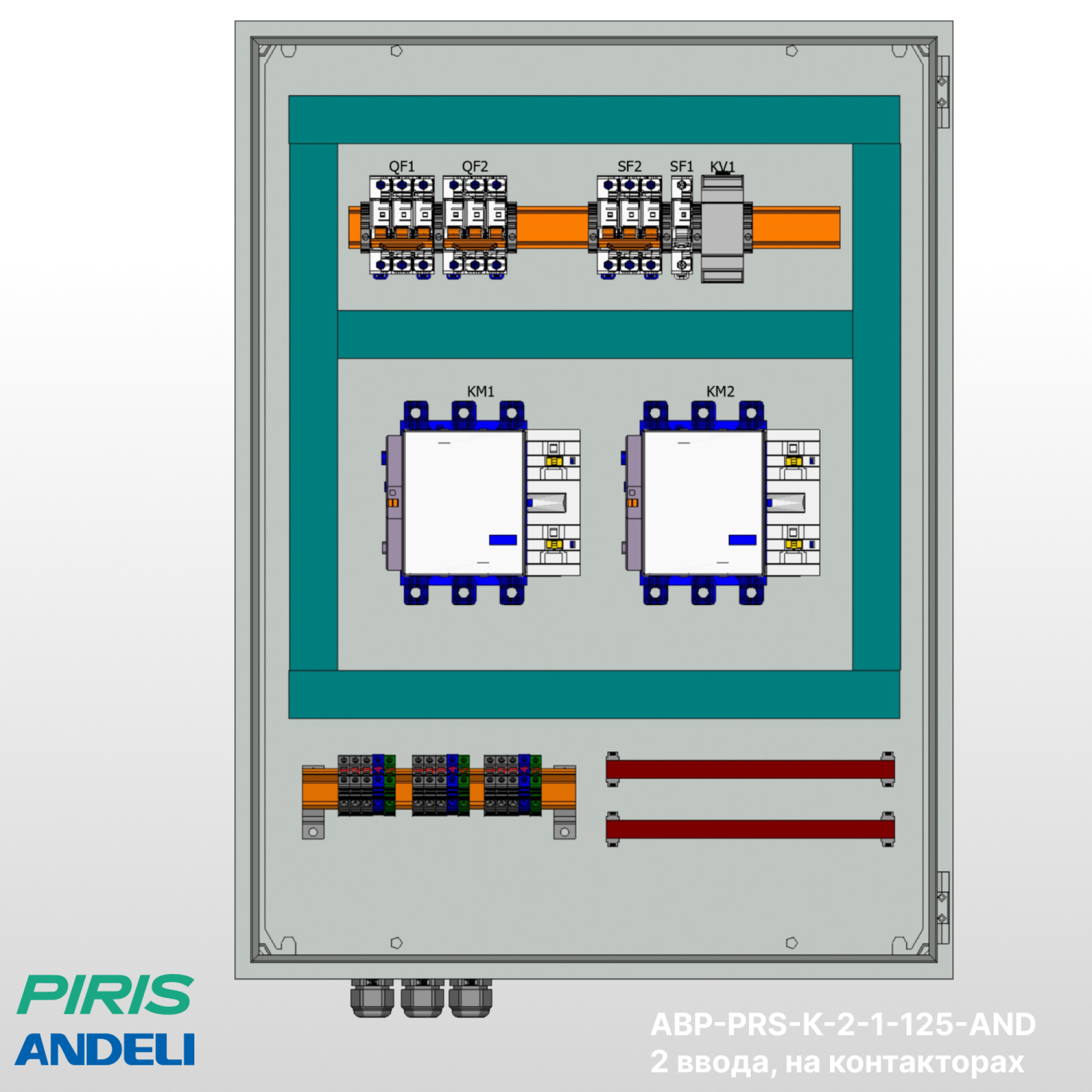 Шкаф АВР-PRS-К-2-1-125-AND — типовой шкаф автоматического ввода резерва на контакторах Andeli с номинальным током 125А и автоматических выключателях Andeli. Обеспечивает автоматическое переключение нагрузки на резервный ввод при аварии на основном с функцией самовозврата.