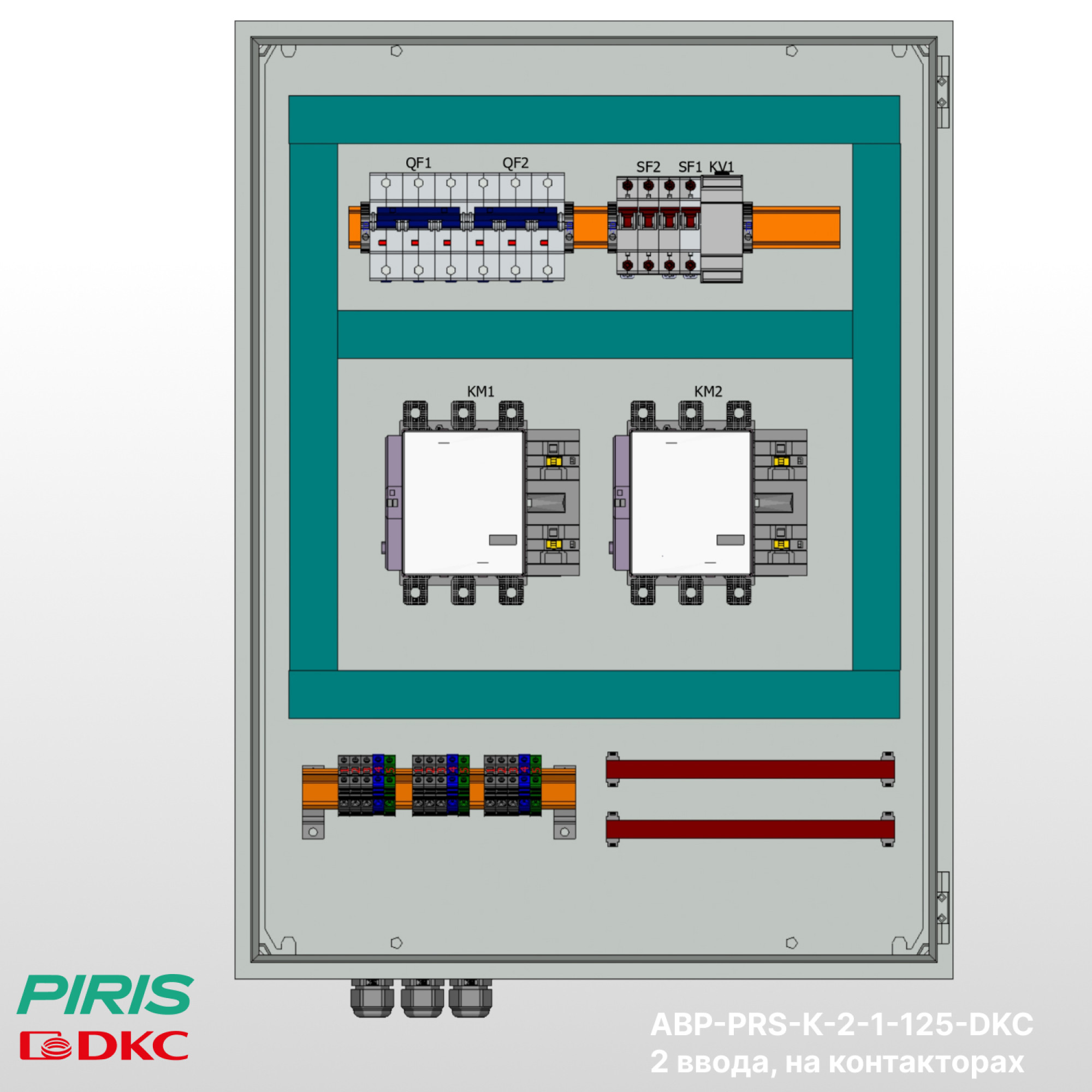 Шкаф АВР-PRS-К-2-1-125-DKC — типовой шкаф автоматического ввода резерва на контакторах DKC с номинальным током 125А и автоматических выключателях DKC. Обеспечивает автоматическое переключение нагрузки на резервный ввод при аварии на основном с функцией самовозврата.