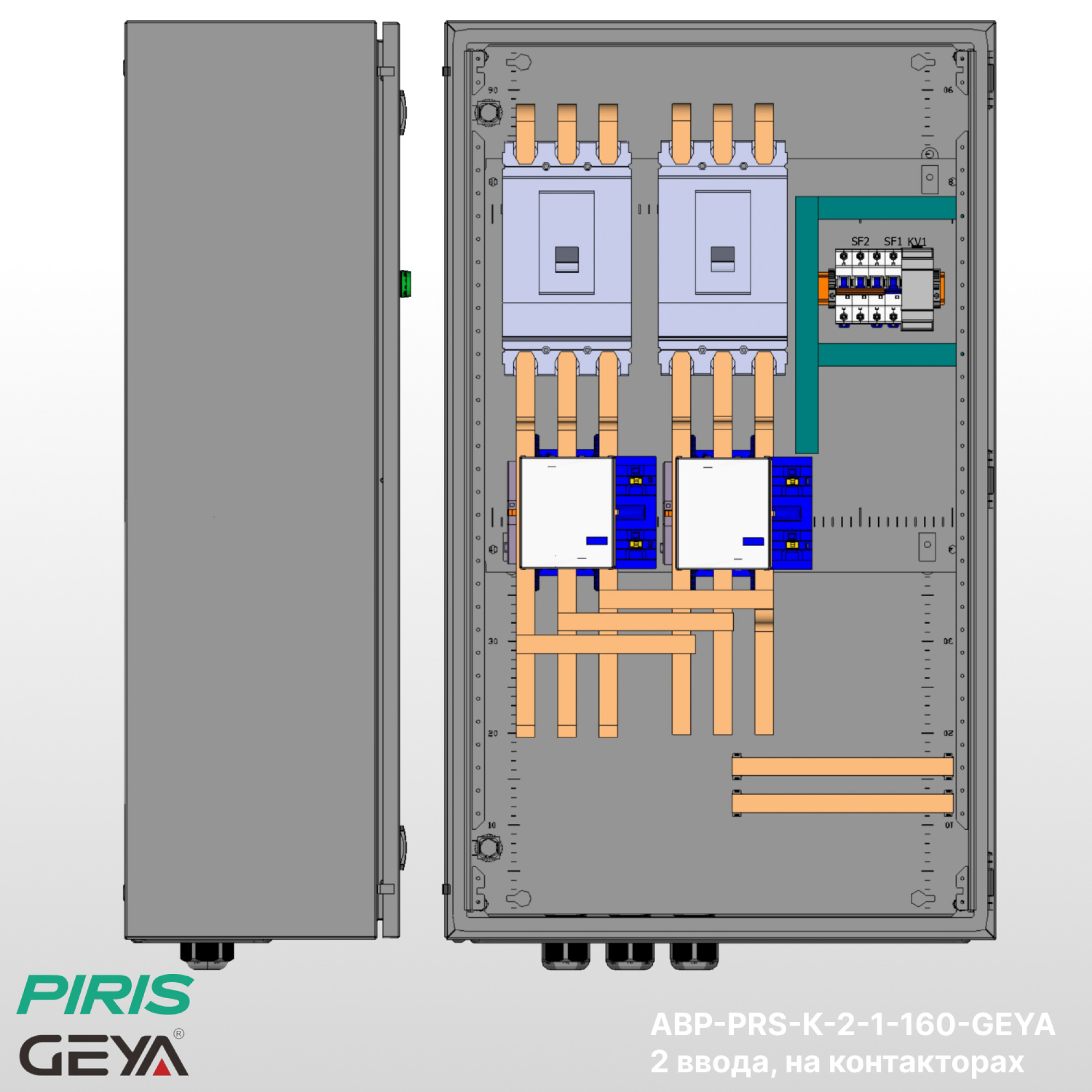 Шкаф АВР-PRS-К-2-1-160-GEYA — типовой шкаф автоматического ввода резерва на контакторах GEYA с номинальным током 160А и автоматических выключателях GEYA. Обеспечивает автоматическое переключение нагрузки на резервный ввод при аварии на основном с функцией самовозврата.