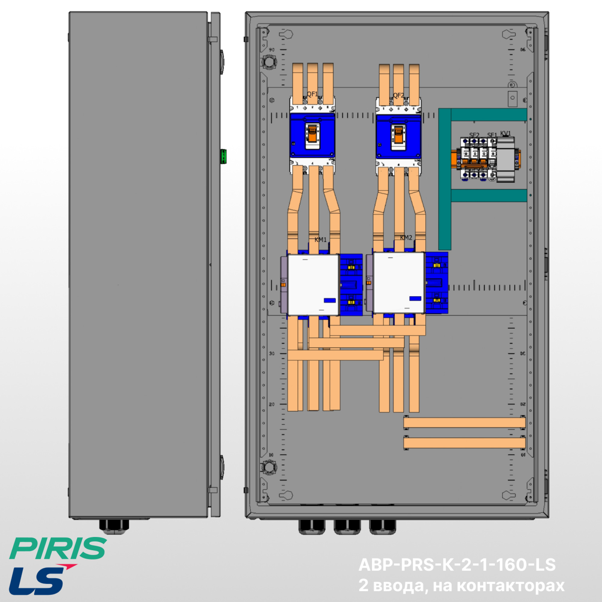 Шкаф АВР-PRS-К-2-1-160-LS — типовой шкаф автоматического ввода резерва на контакторах LS с номинальным током 160А и автоматических выключателях LS. Обеспечивает автоматическое переключение нагрузки на резервный ввод при аварии на основном с функцией самовозврата.