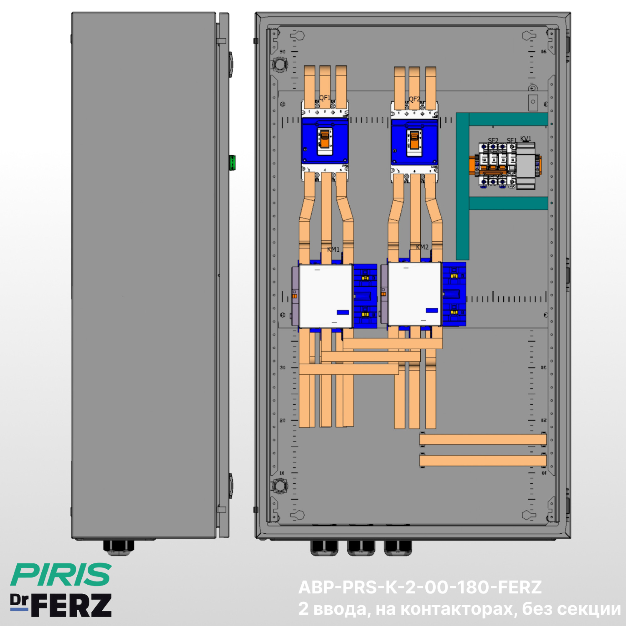 Шкаф АВР-PRS-К-2-1-180-FERZ — типовой шкаф автоматического ввода резерва на контакторах FERZ с номинальным током А и автоматических выключателях FERZ. Обеспечивает автоматическое переключение нагрузки на резервный ввод при аварии на основном с функцией самовозврата.