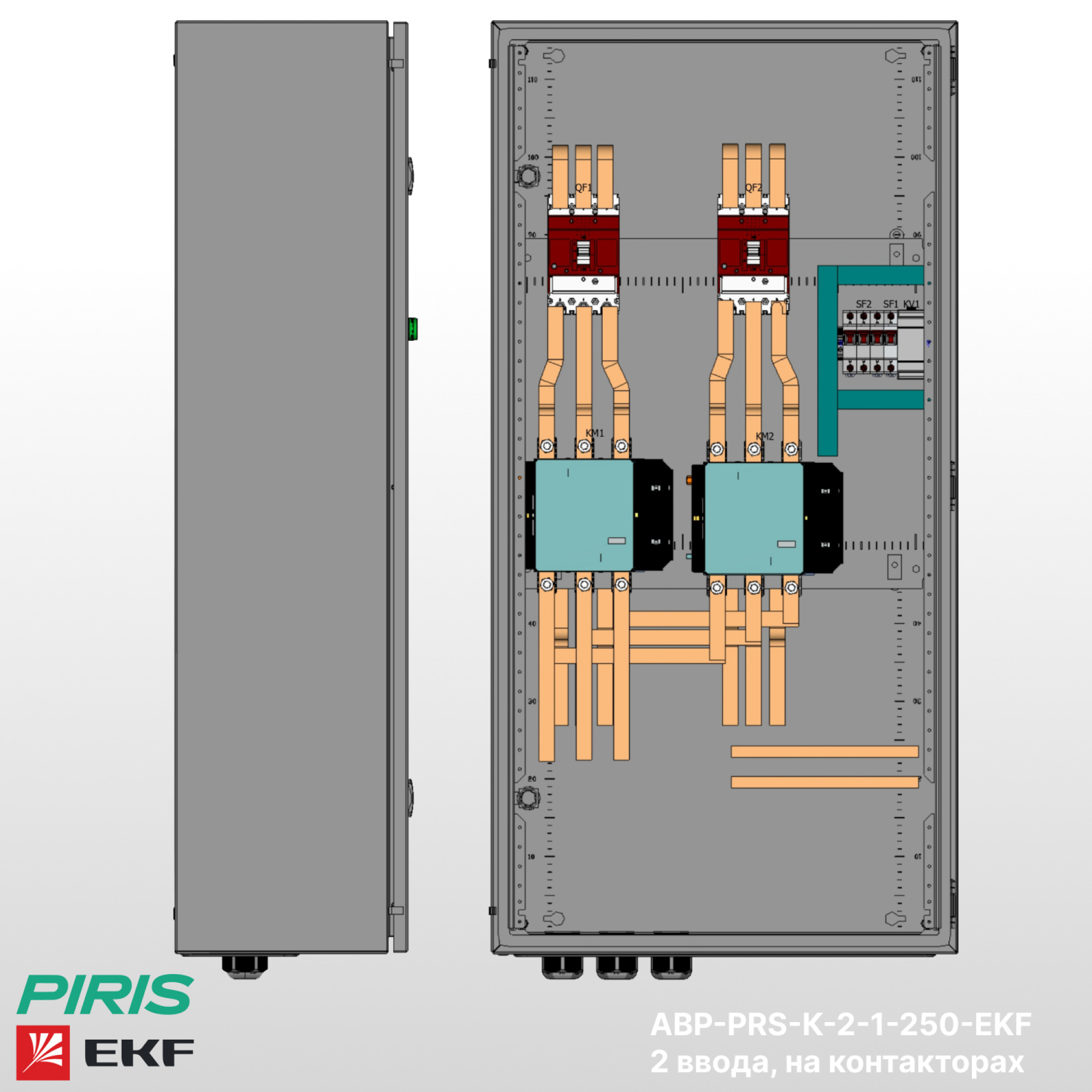 Шкаф АВР-PRS-К-2-1-250-EKF — типовой шкаф автоматического ввода резерва на контакторах EKF с номинальным током 250А и автоматических выключателях EKF. Обеспечивает автоматическое переключение нагрузки на резервный ввод при аварии на основном с функцией самовозврата.