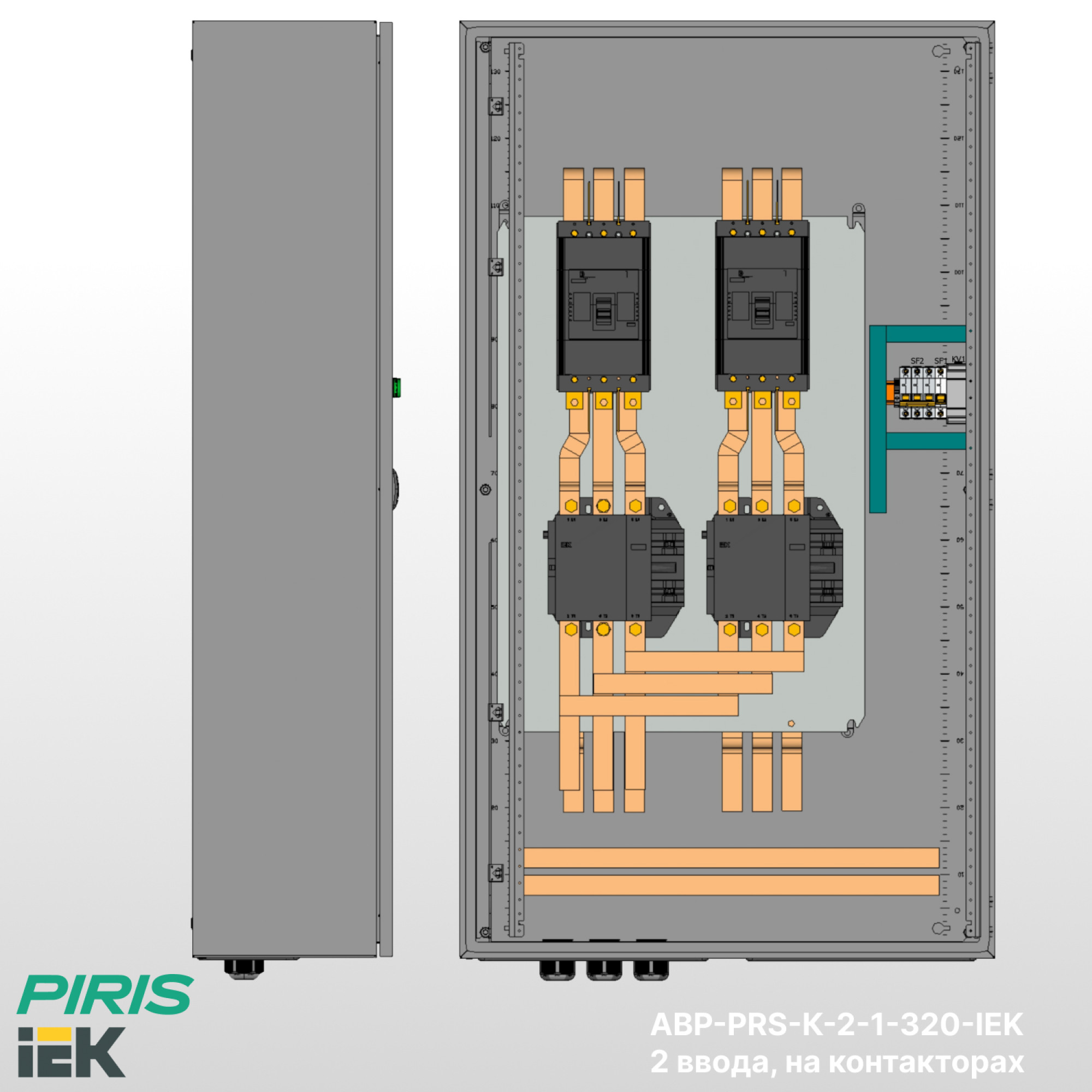 Шкаф АВР-PRS-К-2-1-320-IEK — типовой шкаф автоматического ввода резерва на контакторах IEK с номинальным током 320А и автоматических выключателях IEK. Обеспечивает автоматическое переключение нагрузки на резервный ввод при аварии на основном с функцией самовозврата.