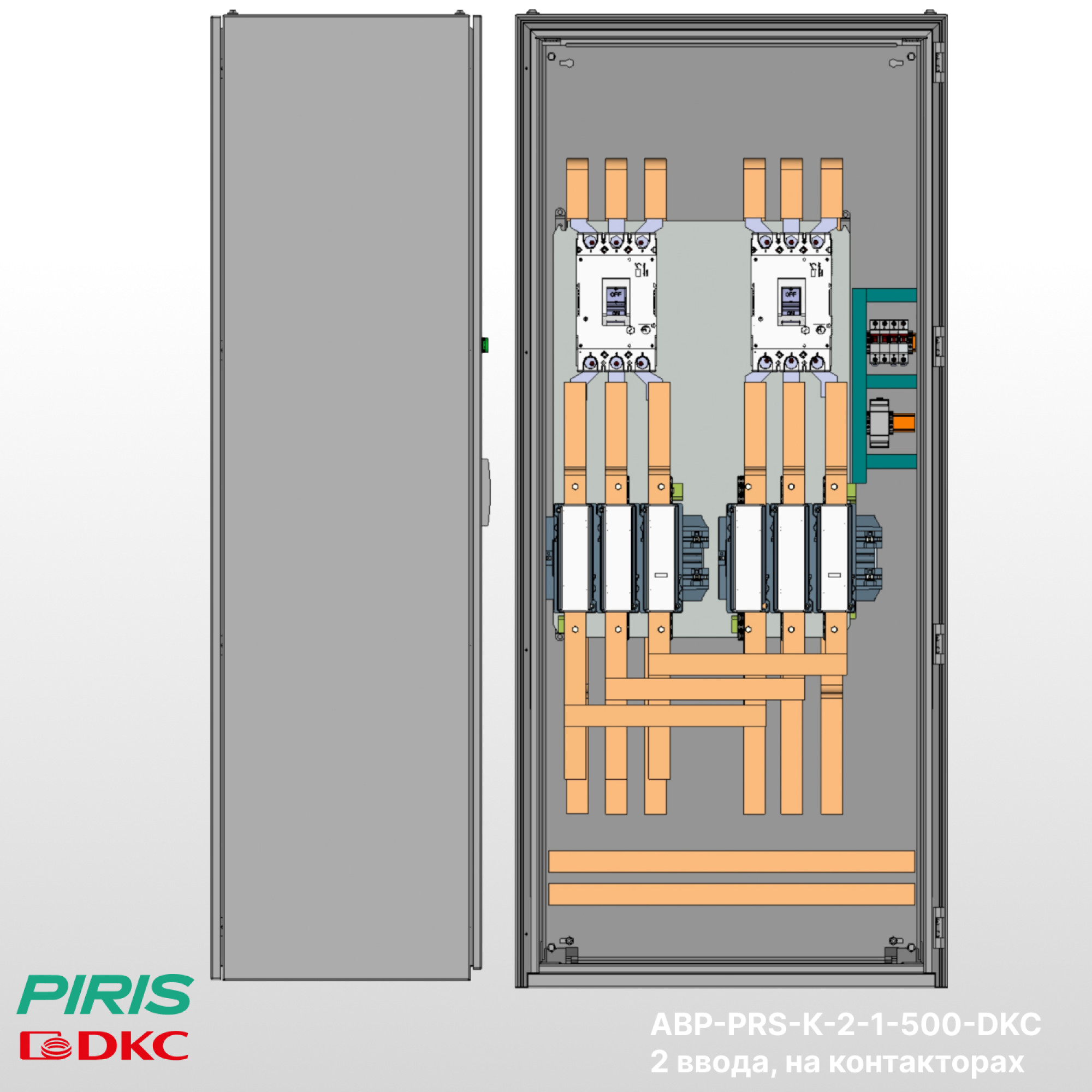 Шкаф АВР-PRS-К-2-1-500-DKC — типовой шкаф автоматического ввода резерва на контакторах DKC с номинальным током 500А и автоматических выключателях DKC. Обеспечивает автоматическое переключение нагрузки на резервный ввод при аварии на основном с функцией самовозврата.