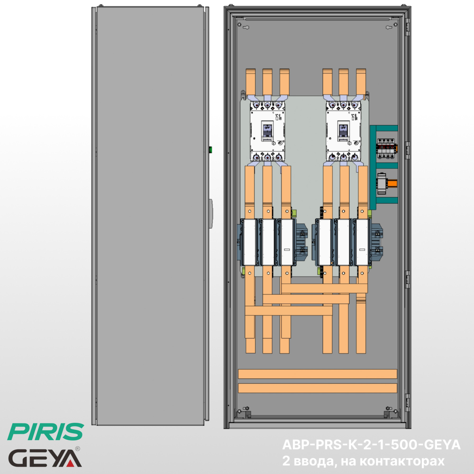 Шкаф АВР-PRS-К-2-1-500-GEYA — типовой шкаф автоматического ввода резерва на контакторах GEYA с номинальным током 500А и автоматических выключателях GEYA. Обеспечивает автоматическое переключение нагрузки на резервный ввод при аварии на основном с функцией самовозврата.
