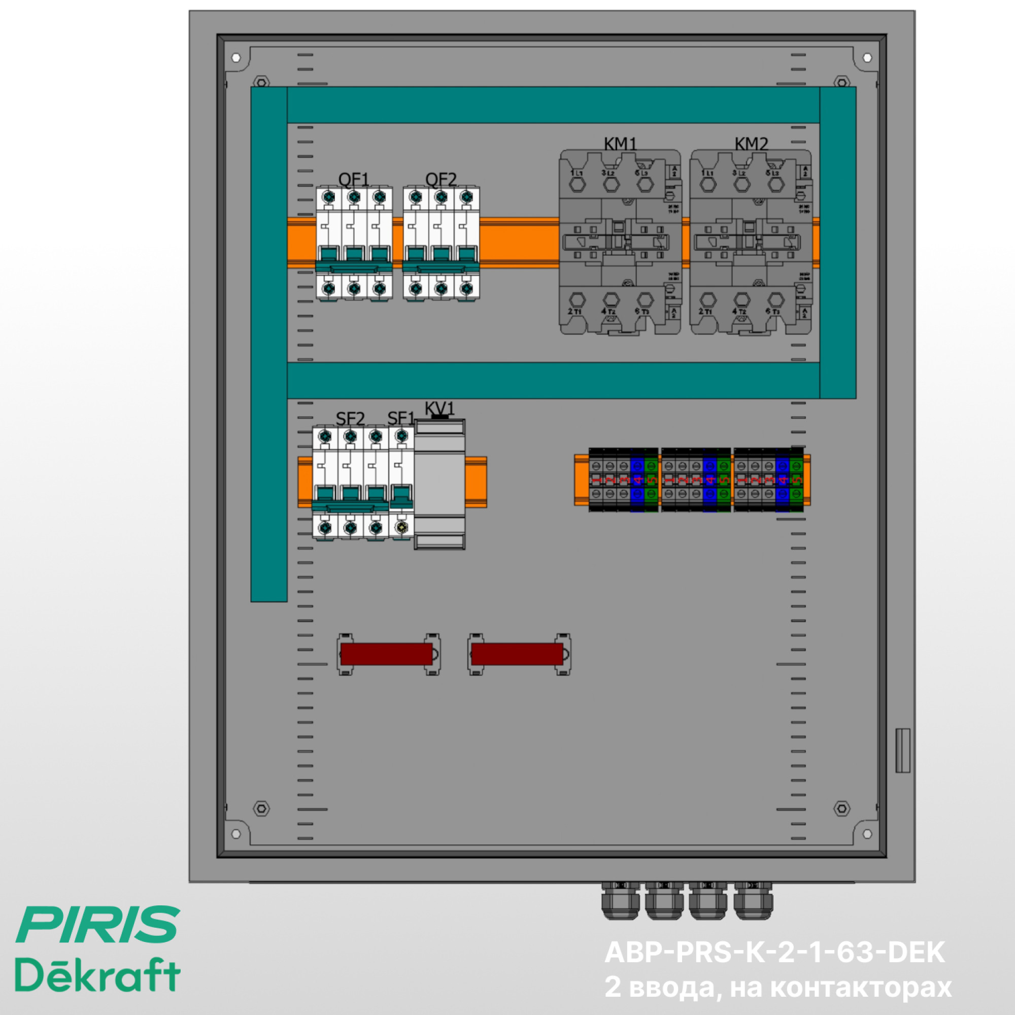 Шкаф АВР-PRS-К-2-1-63-DEK — типовой шкаф автоматического ввода резерва на контакторах Dekraft с номинальным током 63А и автоматических выключателях Dekraft. Обеспечивает автоматическое переключение нагрузки на резервный ввод при аварии на основном с функцией самовозврата.