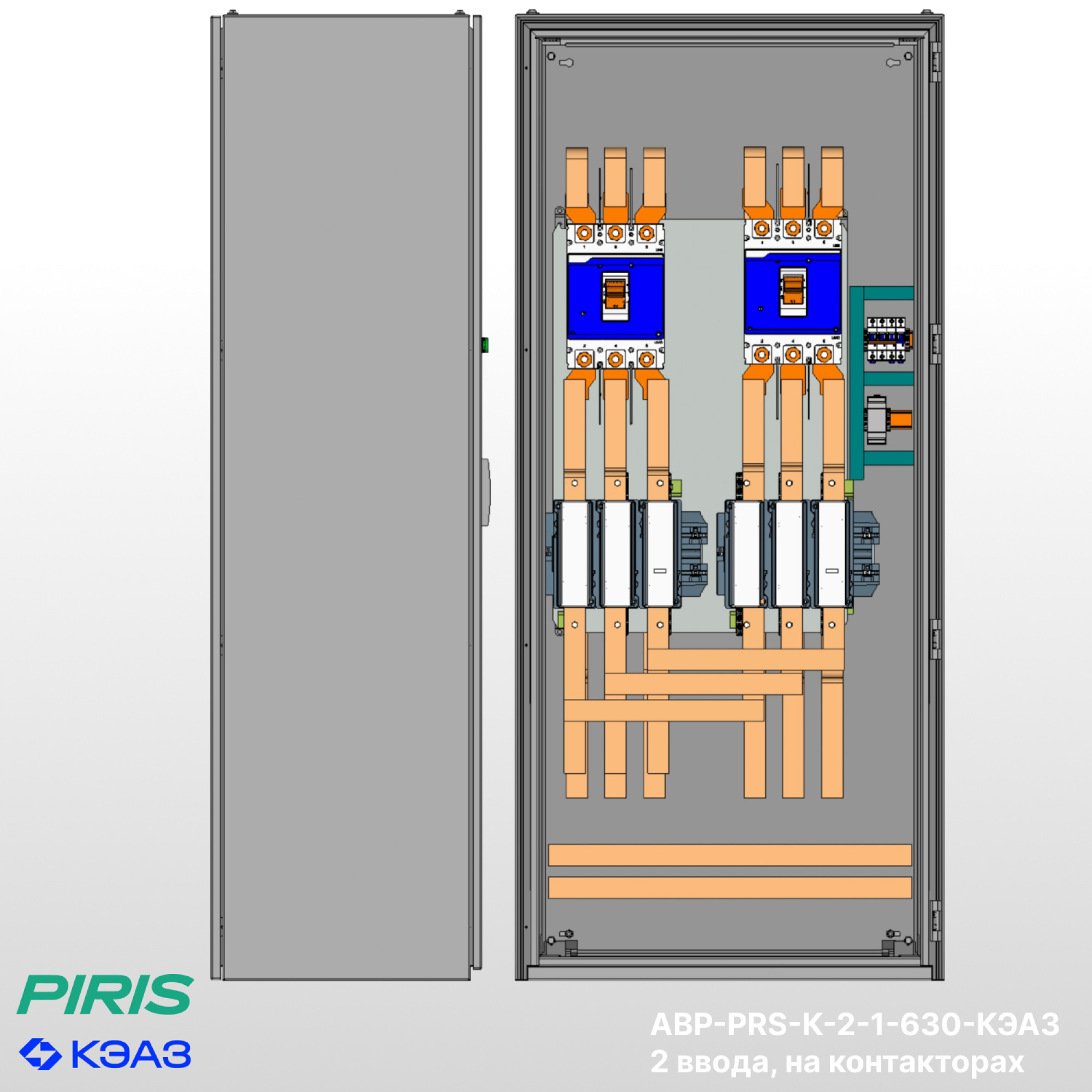 Шкаф АВР-PRS-К-2-1-630-KEAZ — типовой шкаф автоматического ввода резерва на контакторах КЭАЗ с номинальным током 630А и автоматических выключателях КЭАЗ. Обеспечивает автоматическое переключение нагрузки на резервный ввод при аварии на основном с функцией самовозврата.