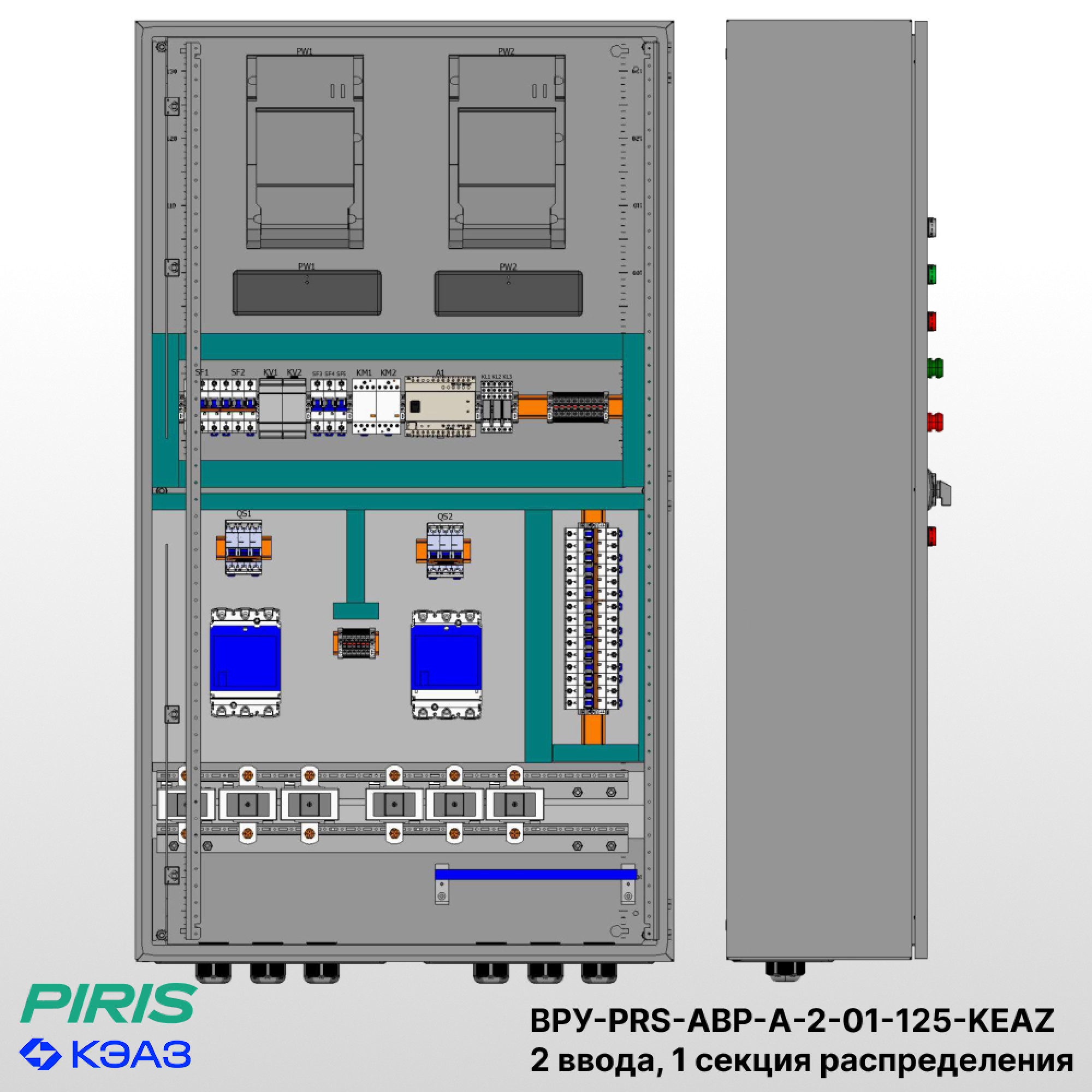 ВРУ-PRS-АВР-А-2-01-125-KEAZ — вводно-распределительное устройство с АВР навесного исполнения в корпусе 1800×800×600 (IP31). Предназначено для бесперебойного электроснабжения объектов 1-й категории надёжности.